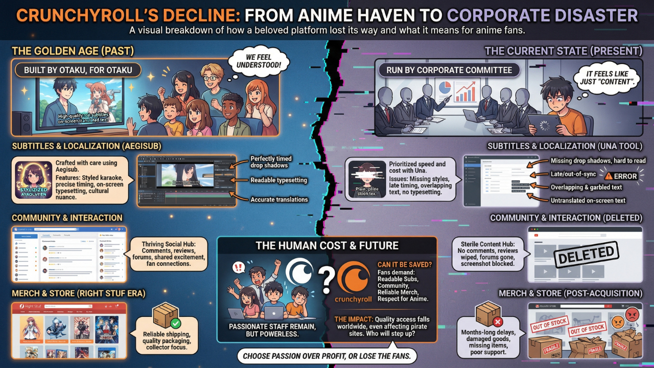 Let’s talk about why Crunchyroll is in trouble. From busted subtitles to the death of its fan community, this isn’t just a tech issue. It’s a cultural one.